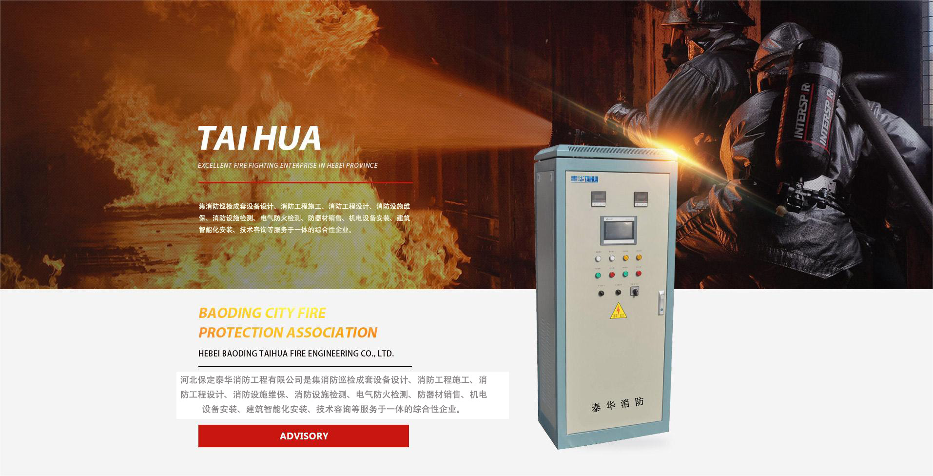 河北保定泰華消防工程有限公司是集消防巡檢成套設備設計、消防工程施工、消防工程設計、消防設施維保、消防設施檢測、電氣防火檢測、防器材銷售、機電設備安裝、建筑智能化安裝、技術容詢等服務于一體的綜合性企業。